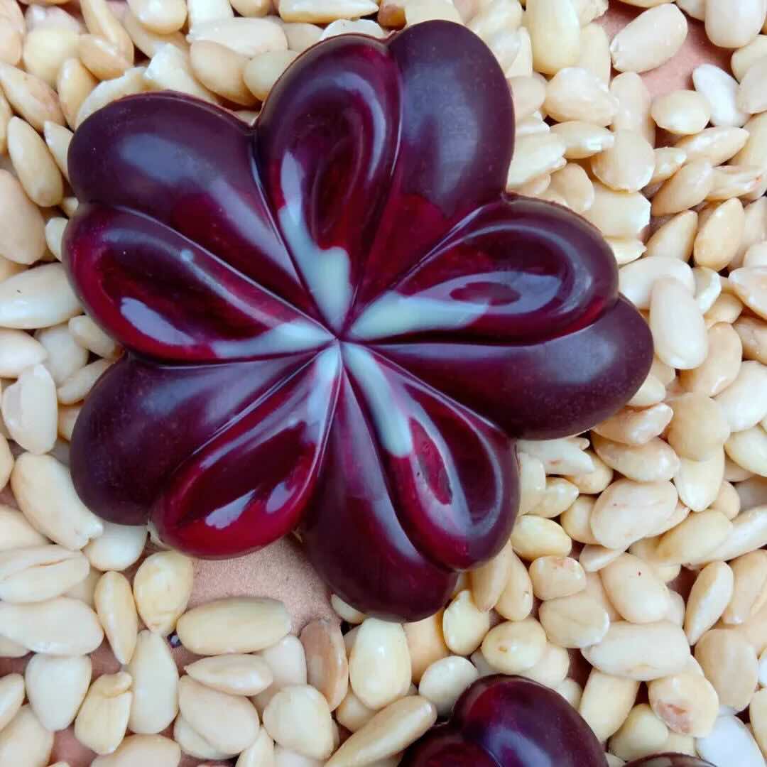 5. une tablette fleur en chocolat Mayan red 62% de cacao garnie d’un praliné amandes locales au jasmin